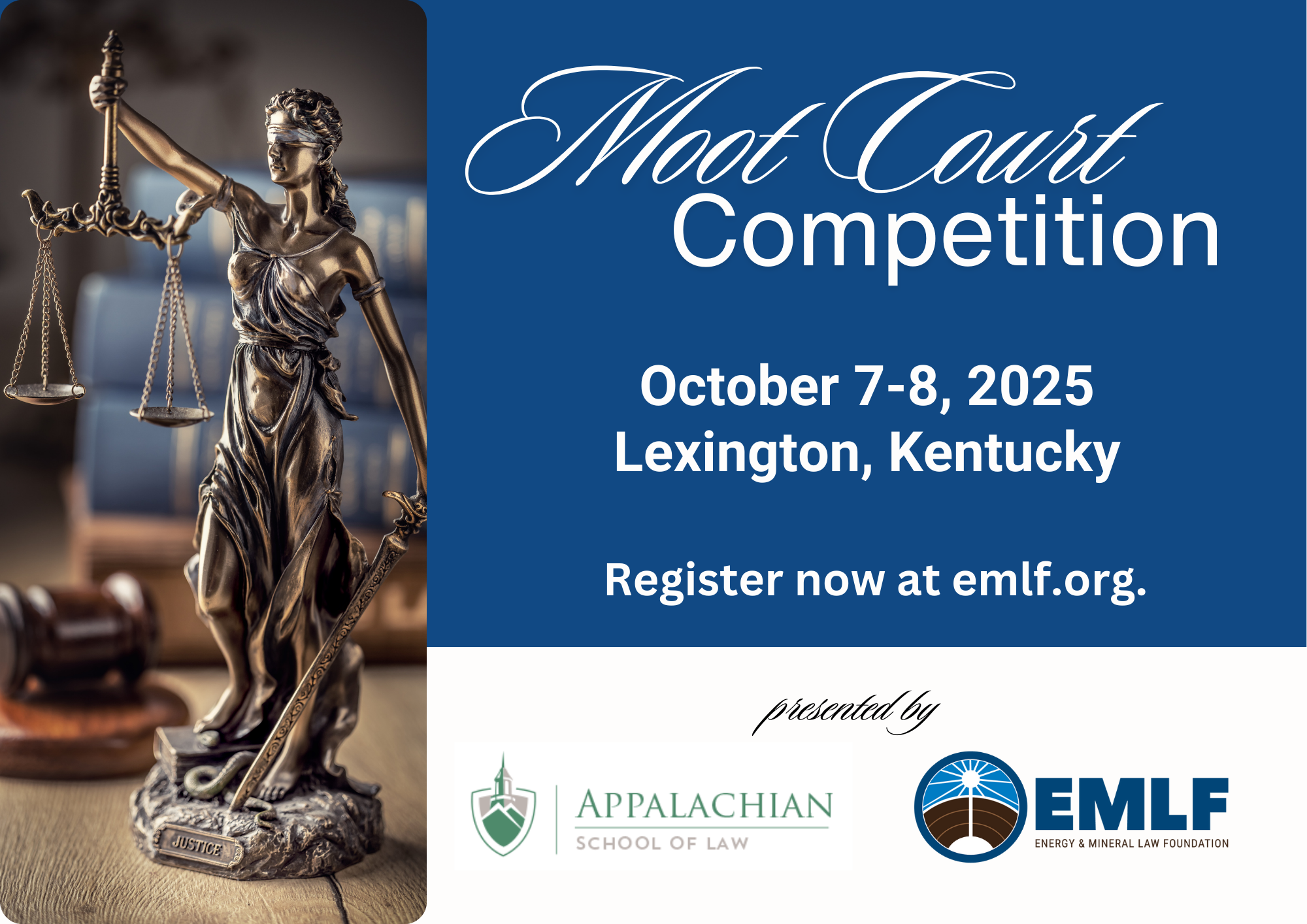 The Energy and Mineral Law Moot Court Competition is an inter-law school appellate moot court competition sponsored by the Appalachian School of Law (“ASL”) and the Energy and Mineral Law Foundation (“EMLF”). It is held in Lexington, Kentucky, in conjunction with the EMLF Fall Symposium. Moot Court Competition participants are invited to attend the sessions and events of the Fall Symposium.